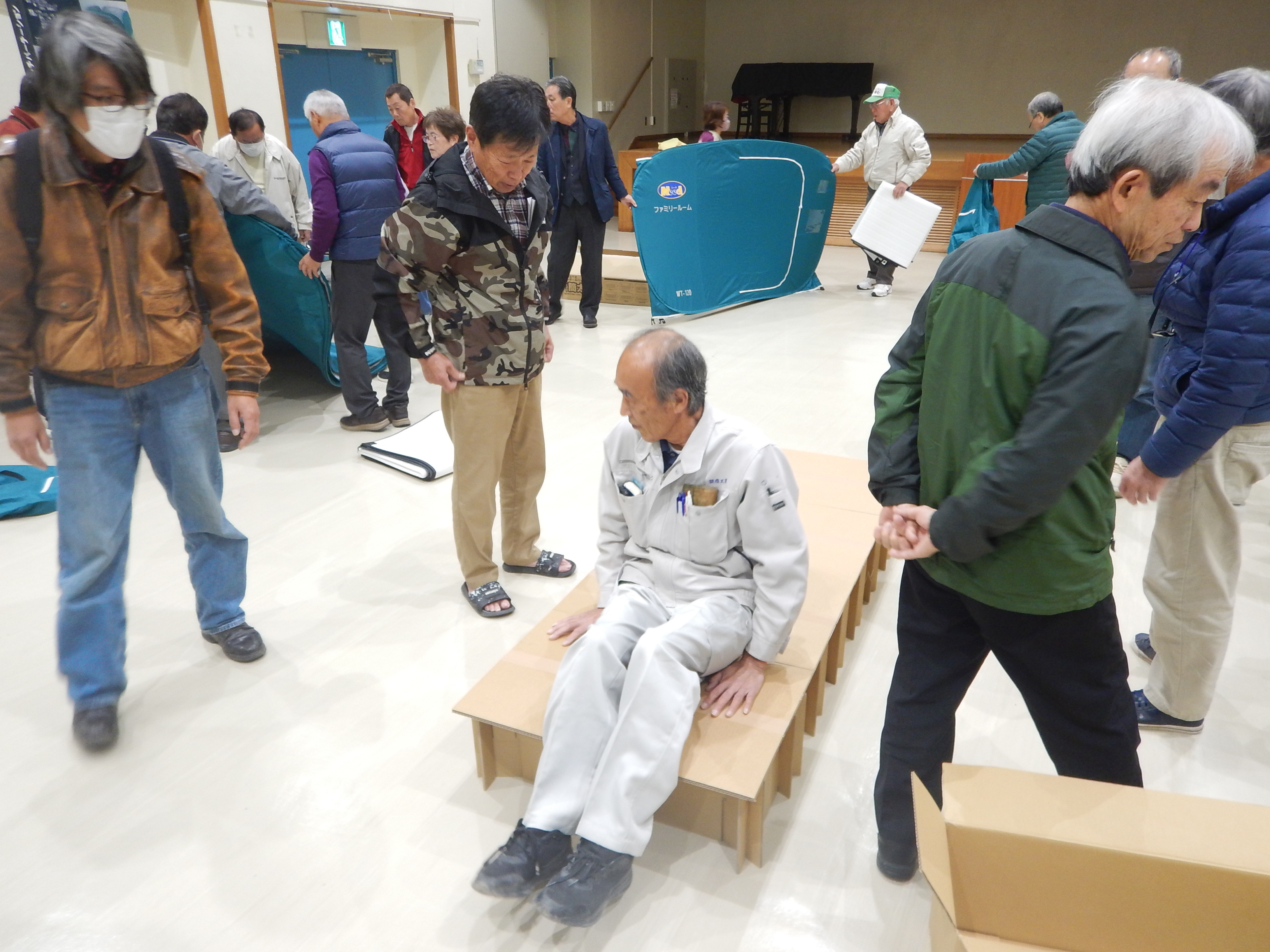 中央公民館で、避難所開設訓練を実施しました。今回の訓練では、コミュニティの役員・運営委員・校区内の防災士など28人が参加し、段ボールベッドや簡易トイレの組み立てなど、避難所開設の体験活動を行いました。
