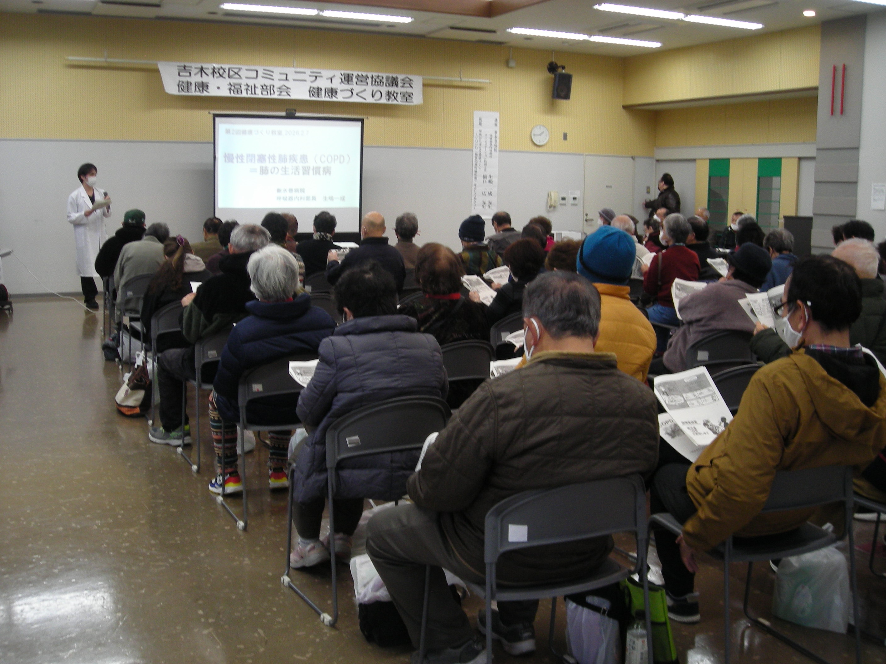 いこいの里で催され、67人が参加。福岡新水巻病院の生嶋一成先生と橋口一広先生を講師に迎え、COPD(慢性閉塞性肺疾患)の症状や主な原因である喫煙リスク、進行を抑える治療法などを学びました。参加者からは「具体的な症状を聞くことで、自分の健康を考える良い機会になった」などの声が聞かれました。